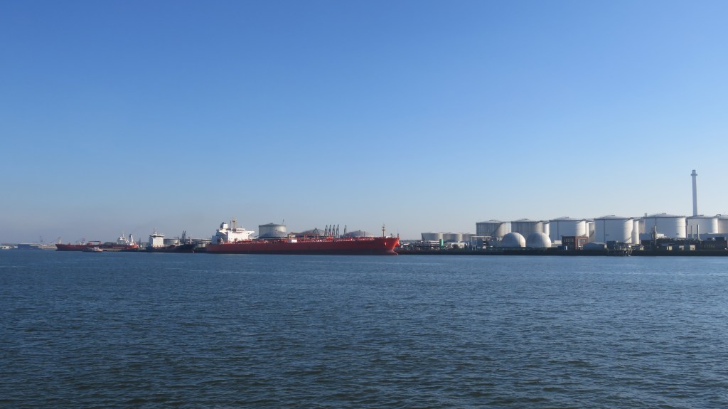 Maar waar is dit precies? Dat had ik al eerder uitgezocht. Op deze plek werd de Tweede Petroleumhaven gebouwd. Er staan nu de tanks van Euroloop Gas and Liquid Calibration. Ik ben in Vlaardingen aan de Oosthaven gaan kijken, waar je ongeveer in dezelfde hoek de rivier overkijkt.