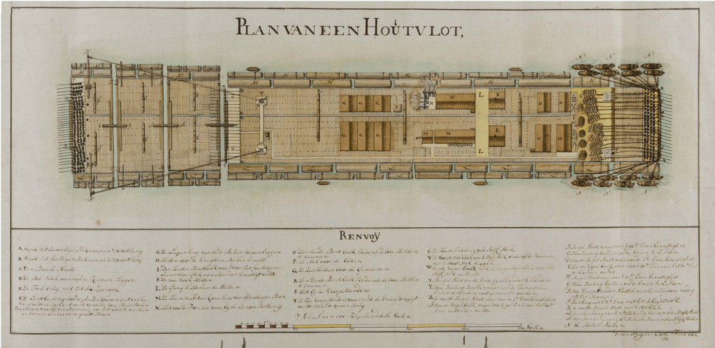 Het hele gevaarte werd in Duitsland opgebouwd en zakte dan de Rijn af naar de Hollandse delta. Ze heetten ‘Hollandervlotten’, wat niet naar Nederland verwees, maar naar de lange, rechte stammen waaruit ze bestonden. Zo’n gevaarte de bochten door manoeuvreren was nogal een kunst. Het vlot bestond aan de voorkant uit scharnierende delen, zodat het kon draaien. Met roeispanen en roeiboten werd het op koers gehouden. De vlotten hadden veel bekijks. Soms liep een hele stad uit om een vlot voorbij te zien komen.